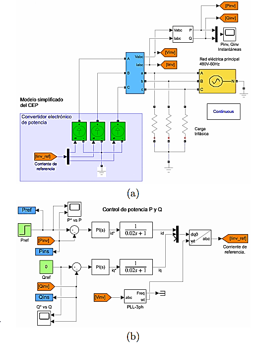 Una vez generadas las señales ide iq, estas tienen que ser transformadas a un marco referencial trifásico abc antes de ser aplicadas a la fuente controlada que representa la dinámica del CEP. Para llevar a cabo esta transformación, la fase de la tensión en el PCC es medida en tiempo real por medio de un lazo cerrado de fase (PLL, por sus siglas en inglés) para luego proceder a evaluar la transformada de Park por medio de (1). Finalmente, para retroalimentar a los controladores PI de cada uno de los lazos de control, se miden las potencias instantáneas activa y reactiva inyectadas por las fuentes controladas de corriente en el PCC.
