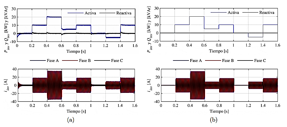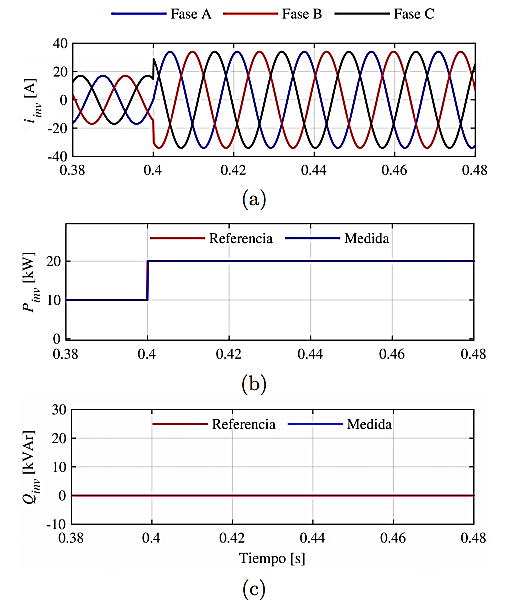 Del mismo modo, en la Figura 7c se puede valorar la efectividad del control de la potencia reactiva, pues, esta variable es mantenida prácticamente en cero en todo el intervalo simulado. Además, esto último pone en manifiesto una de las bondades que ofrece el CEP en su integración a la red: el control desacoplado de potencias P y Q.