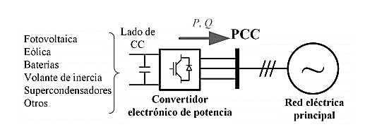 Importar imagen Situación similar se aplica para los sistemas de almacenamiento energético en baterías, en cuyo caso, el flujo energético puede ir de la batería a la red o al revés en función de la necesidad de la red en disponer o almacenar energía [6]. Los convertidores electrónicos de potencia poseen una topología que permite un flujo bidireccional de potencia activa y reactiva en función de las señales de consigna preestablecidas en los sistemas de control que gobiernan la lógica de disparo de los semiconductores que los conforman. Por tanto, desde la perspectiva de la red, estas interfaces se comportan como fuentes controladas de corriente [7].