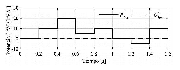 Para evaluar el desempeño del modelo detallado del convertidor electrónico de potencia en el dominio del tiempo en el entorno de simulación, se establece un valor de potencia activa de referencia constante que inicie en 10 kW y, una vez que hayan transcurrido 0,4 s de simulación este cambie a 20 kW. Además, se ha establecido una consigna de la potencia reactiva nula durante el horizonte temporal de simulación, a fin de verificar el control desacoplado PQ que ofrece la filosofía de control mediante coordenadas d − q. Las siguientes figuras muestran los resultados obtenidos en la simulación.