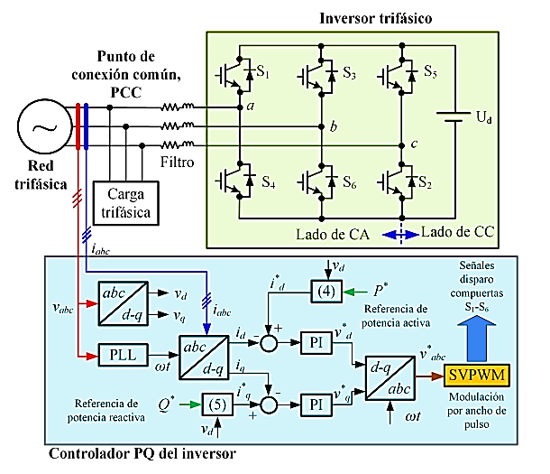 La Figura 2 muestra la configuración típica de un CEP conectado a la red. En la ilustración, es posible distinguir dos subsistemas: el inversor trifásico y su controlador de potencia PQ. El inversor, constituido por un puente de semiconductores de potencia (SCR, MOSFET, IGBT, u otros, según la aplicación), tiene por función convertir la energía proveniente de un sistema de corriente continua (CC) en energía en corriente alterna (CA) para su posterior vertido a la red trifásica, o viceversa. Según qué interruptores estén activados en cada instante de tiempo, el puente irá construyendo una señal de tensión trifásica en sus bornes cuya frecuencia fundamental será heredada de la tensión impuesta por la red en el punto de conexión común (PCC, por sus siglas en inglés) y, cuya amplitud y fase estarán definidas según qué corriente es necesaria inyectar para conseguir un valor predeterminado de potencia activa y reactiva en el PCC por parte del convertidor.