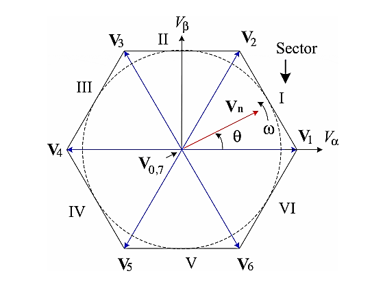 Si se define a la tensión en el lado de CC del inversor como Ud, el inversor es capaz de ofrecer en sus terminales los valores de tensión (de fase VA, VB y VC, y de línea VAB, VBC, VCA) que se indican en la Tabla 1. Ahora bien, el orden de selección de cada una de las ocho combinaciones de conmutación y el tiempo en el que estas deben mantenerse activas es lo que define la técnica SVPWM. La Figura 3 proporciona una idea gráfica de la mecánica de construcción del vector de tensión en los bornes del inversor, Vn, sobre el plano complejo estacionario α − β. Este vector es descompuesto en ocho estados de conmutación: V0 a V7, de los cuales, V1-V6 son vectores activos que forman un hexágono regular (seis sectores) y, V0 y V7 son vectores nulos que reposan en el centro del hexágono. Una descripción detallada del marco teórico de esta técnica de modulación, el cálculo de los tiempos de conmutación para cada uno de los sectores y los criterios de implementación, pueden consultarse en [12, 13,24].