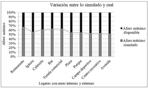 Se deduce que el uso y aplicación del simulador coadyuvará e impulsará en la identificación de lugares con áreas internas por la carencia y tuberización que se tiene muchas veces en lugares de recurrencia poblacional. Los resultados obtenidos en mérito al aforo máximo simulado y el aforo máximo disponible reflejan una variación producto del área disponible que depende de cada lugar en el que se desea hacer uso del simulador para conocer el aforo máximo, tal como se observa en la Figura 5.
