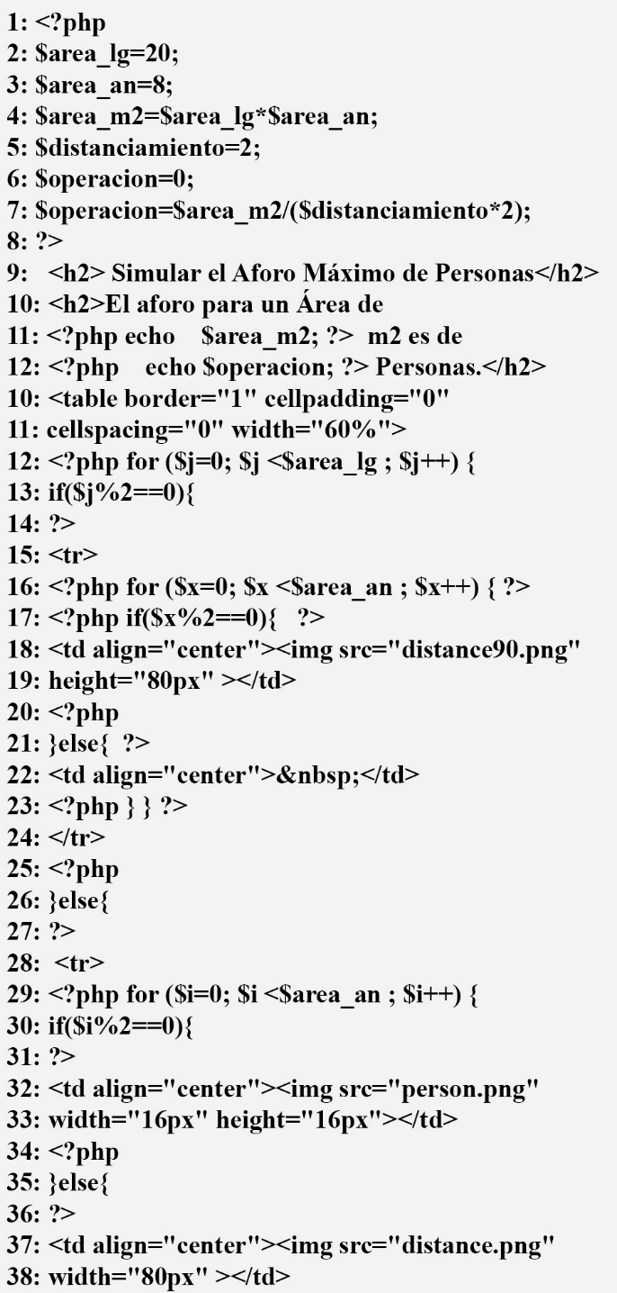 Por lo mencionado, este estudio de investigación tiene como objetivo general hacer uso de las técnicas de programación a través del lenguaje PHP, mediante el ingreso de variables referenciales, como el largo y ancho de un área interna o externa que permita simular y conocer el número de personas que pueden ingresar respetando el distanciamiento social.