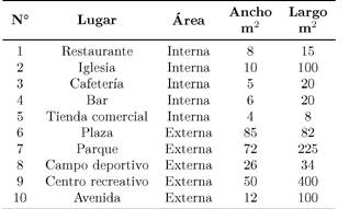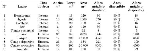 La simulación es una representación artificial de un proceso real [21], donde es simulación y no realidad y se busca lograr un objetivo especial [22]. En este contexto se identificaron diez lugares con áreas internas y externas más comunes y recurrentes por la población residente de la región, provincia y distrito de Piura – Perú, para conocer el aforo máximo de personas que pueden ingresar cumpliendo las normas de bioseguridad a cada uno de los lugares que se visualizan en la Tabla 3.