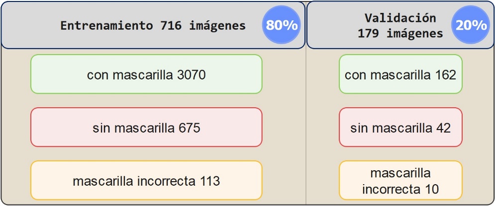 El dataset fue dividido con una distribución de 80 % (716 imágenes) para entrenamiento y el 20 % (179 imágenes) restante para pruebas (ver Figura 8). Las imágenes del conjunto de datos personalizado, para el entrenamiento contienen la detección de una persona o varias personas dentro de la misma. Lo que representa para el entrenamiento 3070 personas con mascarilla correcta, 675 sin mascarilla y 113 con mascarilla incorrecta.