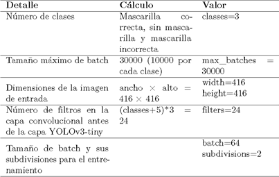 De esta manera, luego del entrenamiento se podrá evaluar el desempeño del algoritmo en datos no vistos [23]. Mientras que, en la fase de ejecución del entrenamiento de la red neuronal especializada en la detección de mascarillas, se utiliza la técnica «transfer learning», que consiste en transferir el conocimiento de un modelo preentrenado en un contexto general, a uno más específico [24]. Es decir, para la detección de las tres clases (con mascarilla, sin mascarilla y mascarilla incorrecta) se tomará el modelo base de YOLOv3-tiny preentrenado en la detección de ochenta clases de objetos.