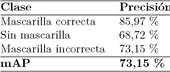El proceso de entrenamiento duró 16 horas, obteniendo una media de la precisión promedio (mAP) de 75,95 %. Finalmente, se validó la red neuronal entrenada con el 20 % restante del dataset (79 imágenes), esto representa 162 personas con mascarilla correcta, 42 sin mascarilla y 10 con mascarilla incorrecta. En la Tabla 3 se muestra los resultados correspondientes a la validación.
