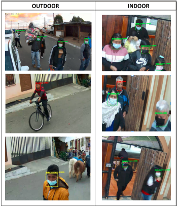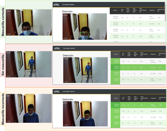 En la unidad central de procesamiento se ejecuta el algoritmo AIoT para la detección de uso de mascarillas en tiempo real. Posteriormente, en el caso de ocurrir una detección se producen cuatro salidas en los actuadores del sistema: 1) la transmisión de las imágenes correspondientes a las detecciones realizadas a un repositorio de la nube, 2) una alerta sonora que resalta la clase de la detección, 3) la activación de LED dependiendo de la clase detectada, y 4) la visualización de la detección en una pantalla. Finalmente, en la Figura 5, se evidencia los resultados de la inferencia en el modelo computacional Edge.