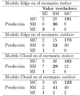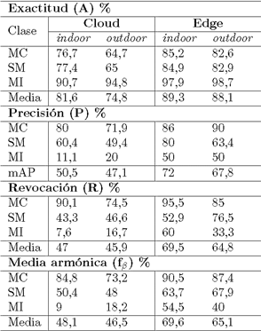 En la Tabla 5 se muestran los resultados obtenidos después de evaluar las implementaciones Edge y Cloud para la detección del uso de mascarillas buconasales por parte de las personas en los dos ambientes indoor y outdoor, en tiempo y escenarios reales.