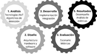 El AIoT combina dos enfoques, a saber el IoT y la Inteligencia Artificial (AI-Artificial Inteligence, por sus siglas en inglés) [13]. El enfoque IoT se refiere al concepto de interconectar objetos a la red, de tal manera que la información pueda ser recolectada a través de sensores automáticamente, sin la intervención exclusiva de personas [14]. Mientras que la AI se refiere al enfoque de dotar a las máquinas inteligencia a través de algoritmos, para que puedan tomar decisiones según un entrenamiento previamente recibido [15]. Al unir ambos enfoques se intenta adherir una capa cognitiva a la red, para alcanzar la optimización de recursos a través de la autonomía que se logre dar a las máquinas para analizar situaciones y tomar decisiones. El procesamiento de información multimedia es un gran desafío para los algoritmos AIoT debido a la gran cantidad de datos que esta actividad implica procesar y debido a los recursos limitados de IoT. Particularmente, en el presente caso de estudio «detección de uso de mascarilla en tiempo real», se pretende evaluar el rendimiento de los algoritmos AIoT en los modelos computacionales Cloud y Edge.