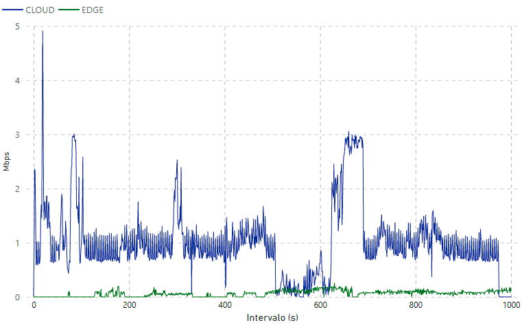 Como resultado se puede evidenciar que el tráfico de la red es significativamente superior en el modelo Cloud en comparación al generado en el modelo Edge. La media de tráfico de red en Cloud es de 0,86 Mbps, con un máximo de 4,91 Mbps; mientras que la media de tráfico de red en Edge es de 0,07 Mbps, con un máximo de 0,26 Mbps. Esto se debe a que en el modelo Cloud se transmiten todos los fotogramas del sensor visual, sin hacer previamente un filtro de información; mientras que en el modelo Edge únicamente se transmite imágenes cuando existe una detección, lo que evita la saturación de la red.