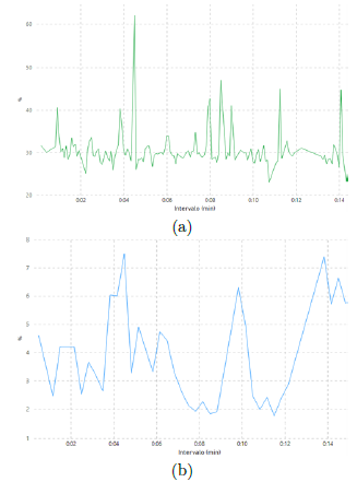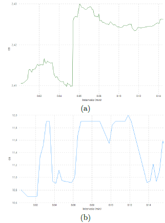 Las medidas del tráfico de la red generadas por la transmisión de video desde la cámara IP en el modelo Cloud, e imágenes desde de la Jetson Nano en el modelo Edge, fueron tomadas mediante el analizador de protocolos Wireshark en la interfaz de entrada del servidor donde se aloja modelo Cloud y la plataforma web. Se tomaron medidas de tráfico utilizando como parámetros de codificación de video a 1008 Kbps, observando el comportamiento del tráfico en volumen de Mbps. En la Figura 11, se puede observar el tráfico de red generado, la curva superior de color azul representa el tráfico desde la cámara IP al modelo computacional Cloud mediante el protocolo RSTP, y la curva inferior de color verde representa el tráfico generado por la transmisión de imágenes procesadas con el algoritmo de detección en el modelo Edge a la plataforma web (medido en Mbps). Dicha información está representada en forma de series a través del tiempo, la misma que corresponde a los primeros 15 minutos de monitoreo en el ambiente indoor.