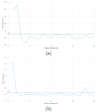 De acuerdo con Ashouri et al. [42] y el estándar ISO/IEC 25023, el tiempo de respuesta de un sistema es otra métrica que nos permite evaluar el desempeño de un sistema. Particularmente, en el presente trabajo, para obtener el valor del tiempo de respuesta se utilizaron los tiempos de eventos marcados en los archivos de log, y de esta manera identificar con exactitud el instante que ingresó la imagen al modelo, para luego calcular el tiempo transcurrido hasta su publicación. En este contexto, para calcular el tiempo de respuesta en la implementación Edge, se consideró el lapso transcurrido entre el instante que se produce la detección hasta que el sistema termina de emitir la alerta sonora. La Figura 14a muestra gráficamente los tiempos de respuesta registrados en el modelo Edge durante las primeras veinte detecciones en el ambiente indoor, obteniendo un promedio de 2,37 segundos de respuesta.