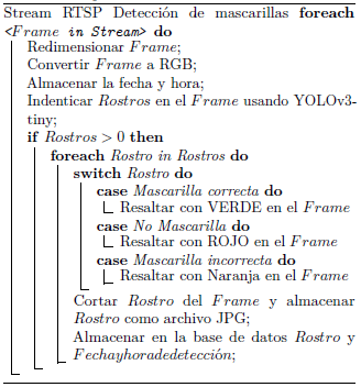 En el algoritmo 1 se describe mediante pseudocódigo el proceso para la detección de las tres clases (mascarilla correcta, sin mascarilla y mascarilla incorrecta). Este algoritmo tiene como entrada el flujo de imágenes (video stream) capturado por el sensor visual de la red, mientras que la salida será la o las detecciones de las personas clasificadas en las tres opciones. Previo al proceso de detección se requiere preparar cada fotograma (frame) del video stream, mediante el redimensionamiento del frame a múltiples escalas de acuerdo con la arquitectura de YOLOv3-tiny. Luego se convierte cada frame a los canales RGB (red, green, blue). Finalmente, se almacena el frame y su fecha de captura.