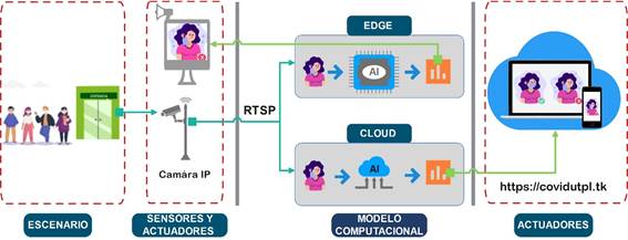 La arquitectura del sistema integra una cámara IP para obtener el video del escenario de prueba, este se envía por medio del protocolo de transmisión en tiempo real (RTSP, por sus siglas en inglés) a los dos modelos computacionales, en estos se ejecuta el procesamiento del video aplicando el algoritmo de detección de objetos en tiempo real basado en YOLOv3 («You only look once v3») para determinar el uso correcto e incorrecto y sin mascarilla. El modelo computacional Edge realiza la inferencia en tiempo real y presenta los resultados en una pantalla marcando en un recuadro los rostros dependiendo del resultado con «Mask correct » (mascarilla correcta), «Mask incorrect» (mascarilla incorrecta) y «No mask» (sin mascarilla), se generan alarmas sonoras y visuales; luego se procede a enviar a una plataforma web en la nube para almacenar las imágenes procesadas. Mientras que en el modelo computacional Cloud se realiza el procesamiento y mediante un dispositivo se puede visualizar el resultado y se almacena la inferencia como se detalla en el modelo Edge.