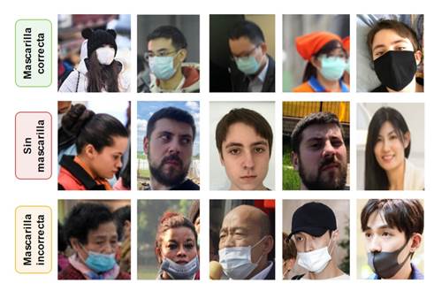 Para el proceso de preparación del algoritmo de detección se requiere de un conjunto de imágenes de entrenamiento y de validación. En este trabajo se requiere entrenar al algoritmo detector de objetos en tiempo real YOLOv3-tiny, para que aprenda y esté en la capacidad de detectar tres clases. Es decir, para la implementación del presente caso de estudio «detección de uso de mascarillas» se entrenará el algoritmo de detección de personas con 1) mascarilla correcta, 2) sin mascarilla y 3) mascarilla incorrecta. La Figura 3 ilustra el conjunto de datos con las tres clases requeridas.