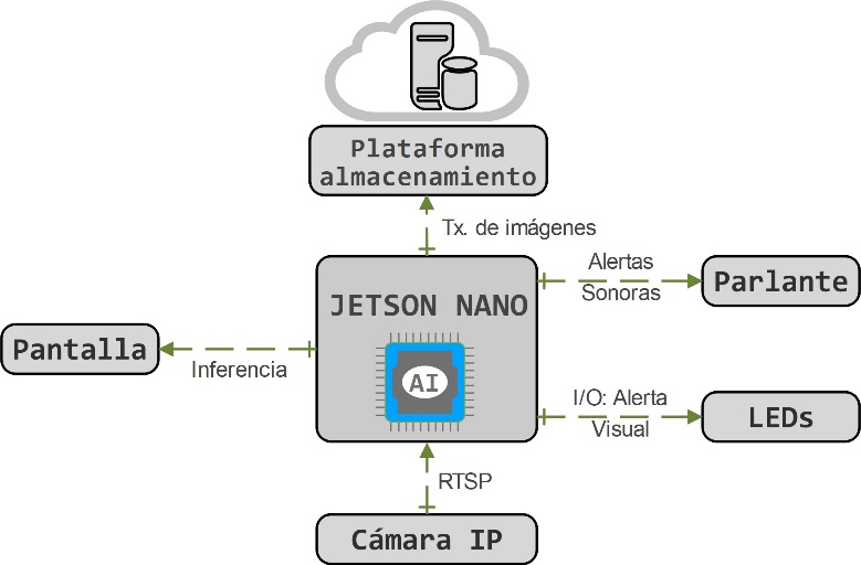 En la Figura 4 se ilustra el diseño de la arquitectura del modelo computacional Edge. Esta tiene como unidad central de procesamiento el componente de Jetson Nano. La cual tiene como entrada el video stream capturado por el sensor visual de la red (cámara IP TpLink Tapo C310 V2).