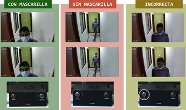 En la Figura 5 se puede evidenciar el funcionamiento del prototipo para los tres casos (mascarilla correcta, sin mascarilla y mascarilla incorrecta). Así mismo, en los escenarios de evaluación las alertas visuales no captaron la atención de las personas cuando el algoritmo AIoT proporciona la retroalimentación de la detección. Inicialmente cuando las personas atravesaban el ángulo de visión de la cámara, en la pantalla se mostraba la salida de los cuadros delimitadores etiquetados y pintados de acuerdo con la clase detectada. Se evidenció que el propósito de la pantalla no era claro para el transeúnte, por lo que algunos saludaban o salían del área de acción de la cámara. Esto cambió, al agregar las alertas auditivas que capturaron más la atención de las personas. Los usuarios escuchaban los siguientes mensajes: «uso de mascarilla correcta», «mascarilla no detectada», o «uso de mascarilla incorrecta»; dependiendo de la clase de detección realizada por el algoritmo, los peatones identificaron el propósito del despliegue intuitivamente. Muchos de ellos corrigieron el mal uso o ausencia de mascarilla de bioseguridad.
