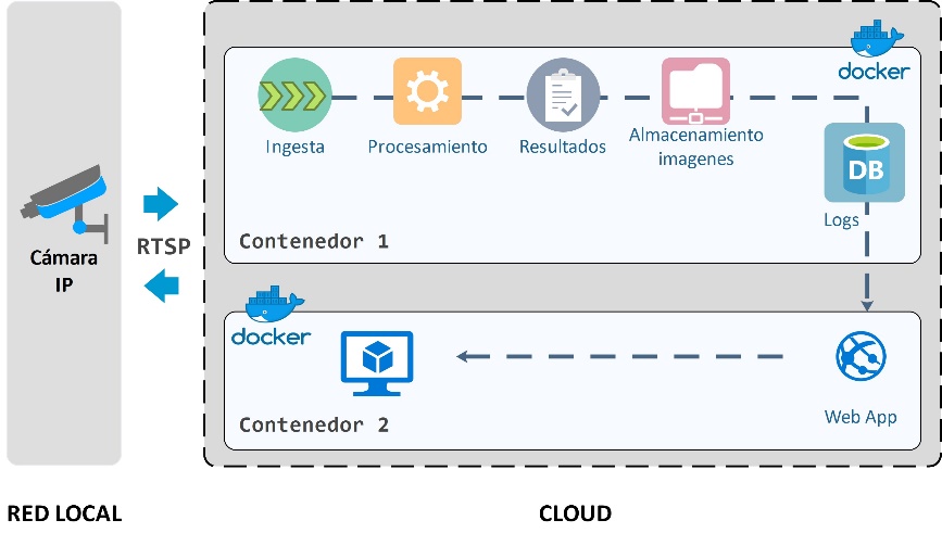 En la Figura 6 se ilustra el diseño de la arquitectura del modelo computacional Cloud. Desde la red local se accede a través del protocolo de transmisión RTSP al video stream capturado por el sensor visual de la red. Mientras que, en la nube, se tienen dispuestos dos componentes usando una arquitectura de contenedores, específicamente Docker [26]. Esto permite agilizar el proceso de despliegue y réplica de la implementación. El primer contenedor tiene la función de procesar el video stream, mientras que la función del segundo contenedor es publicar los resultados del procesamiento.