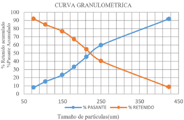 Una vez que se realizó dicho procedimiento [11], los resultados previos del proceso de tamizado se ven en la Figura 7, en donde la curva de % pasante acumulado que representa el porcentaje de muestra con su tamaño equivalente y el % retenido acumulado que representa el porcentaje de material que tiene un tamaño (x) mayor.