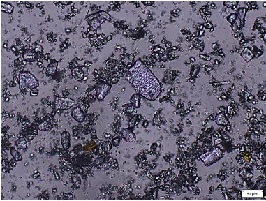 Con el procedimiento mencionado y un aumento de 4x se puede observar que las partículas de lactosa tienen características de forma heterogénea y aleatoria con distintas medidas (Figura 8).