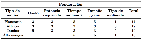 Luego de hacer un análisis de ponderación de los parámetros aplicados a los cuatro tipos de molinos que pueden ser empleados para el proceso de molienda de lactosa: molino planetario, molino attritor, molino de tambor y molino de alta energía; resultó como la mejor opción el molino de tambor, el cual alcanzó el valor más alto de ponderación (ver Tabla 4). Por lo tanto, para el desarrollo del presente proyecto de mejora se utilizó el molino giratorio horizontal de tambor, para determinar fundamentalmente el tiempo, velocidad y distribución de tamaños de material moliente óptimos.