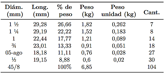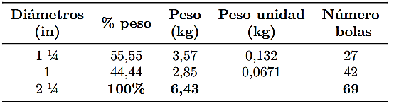 Método 1. En función del diámetro Una vez conocida la carga inicial del material moliente se procede a sumar los diámetros de las bolas que piensa usarse. La sumatoria corresponde al 100 %. Seguidamente, se determina el porcentaje que corresponde al valor de cada diámetro. El resultado que se obtenga corresponde al porcentaje en peso, de la carga inicial, que corresponde a cada tamaño de cylpebs.