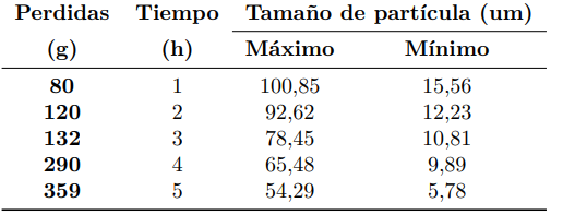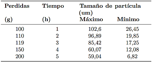 Con lo determinado y haciendo estimaciones promedio de los tamaños de partículas, de acuerdo con la distribución en los tamices y relacionando con el tamaño de la malla en µm y la fracción retenida en peso, se presenta los valores para estimar el promedio característico de la distribución de los tamaños de grano de lactosa en un valor de 241 µm (Tabla 4). Este valor difiere con el tamaño certificado de partícula de lactosa de 150 µm, estableciéndose la necesidad de optar por otro procedimiento de medición del tamaño de partícula.
