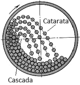 Debe ser menor a la velocidad crítica, situándose un rango de operación de los molinos de bolas o cylpebs entre 65 % y 80 % de Vc[4]. En la Figura 1 se observa el movimiento del molino con sus efectos de cascada y catarata respectivamente.