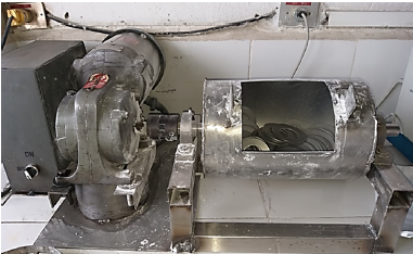 Se usa un molino giratorio horizontal de 20 cm de diámetro y 30 cm de longitud, con una capacidad de 2 kg, potencia de 1 hp y 61,7 rpm de velocidad rotacional; emplea arandelas de acero inoxidable como elementos molientes (ver Figura 4).
