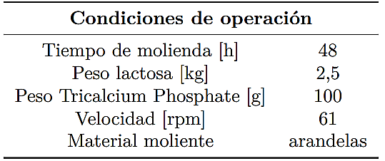En la Tabla 2 se presentan los parámetros utilizados para el proceso de molienda de lactosa.