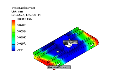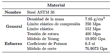 Para el análisis estático, el límite elástico de tracción del acero al carbono ASTM A36 (Tabla 3) utilizado es 250 MPa, con módulo de Young = 199,959 GPa, y coeficiente de Poisson = 0,3. (Figura 6). Suponiendo un máximo esfuerzo de Von Mises de 31,33 MPa (Figura 6) y un límite de deformación de 0,25 mm, se obtuvo un máximo resultado de desplazamiento de 0,09856 mm (Figura 7).