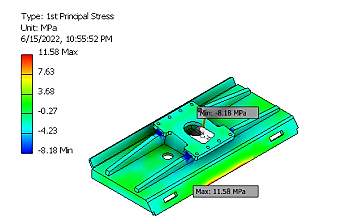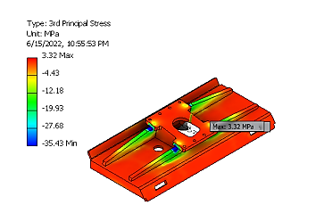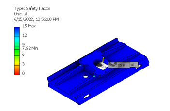 El esfuerzo máximo de tracción de 11,58 MPa (Figura 8) está por debajo de la condición de Von-Mises (32,38 MPa) (Figura 7), porque el esfuerzo fue distribuido a lo largo de la estructura completa. El esfuerzo máximo de compresión fue 3,32 MPa (Figura 9), que fue observado en las interfaces de la estructura de soporte entre la placa base del martillo y la placa base del cargador compacto. El máximo esfuerzo de compresión del acero al carbono ASTM A36 usado es 152 MPa [18]. El mínimo factor de seguridad fue 7,92 (Figura 7), lo cual significa que se alcanza un alto factor de seguridad con este diseño [19] (Table 4).