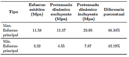 El esfuerzo dinámico excluyendo el pretensado fue 12,37 MPa (Figura 11) y el esfuerzo dinámico total fue 23,95 MPa (Tabla 4). Los valores de las diferencias porcentuales entre los resultados estáticos y dinámicos del esfuerzo máximo principal y esfuerzo mínimo principal son 48,34 % y 42,19 %, respectivamente, los cuales son menores de 50 % (Figura 12).