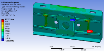 Se realizó una disminución de esfuerzo para hacer un análisis armónico en Ansys Modal y Harmonic Response. Como un primer análisis, es usual evaluar donde ocurrieron las relajaciones de esfuerzo y la eliminación del pretensado en la placa de adaptación. El esfuerzo estático fue 11,58 MPa (Tabla 4) en la etapa inicial. Cuando se inicia la acción dinámica, esta situación se relaja primero. El análisis de esfuerzo dinámico fue utilizado para compensar la compresión estática y para llevar a cero el efecto estático con el fin de revertir la resistencia desarrollada dentro del material.