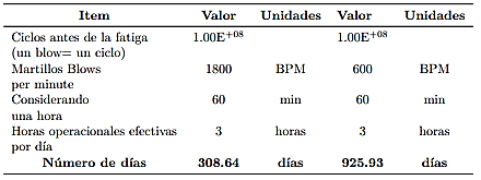 La Tabla 5 muestra el análisis de vida de la fatiga resultante reportado por Ansys; se tuvieron 1.00×108 ciclos hasta la falla estructural (Figura 13). Por esa razón, considerando el desempeño operacional del martillo hidráulico de 600 y 1800 BPM y correlacionando con las horas operacionales por día, resulta en un rango de 308,64 a 925,93 días de operación antes de la falla.