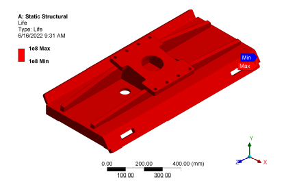 Debido al máximo esfuerzo de 31,33 Mpa (Figura 6) con un factor de seguridad de 7,92 (Figura 10), esto sostiene hasta 1.00 × 108 ciclos (Figura 13) antes de la falla estructural. Este desempeño respalda el objetivo de este diseño de alcanzar la máxima durabilidad mientras actúa también como un fusible que protege la estructura del martillo y del cargador compacto en caso de que ocurra una sobrecarga. La carga de esfuerzo reportada todavía está por debajo del límite de resistencia, debido a que a pesar de los 1.00 × 108 ciclos antes de la fatiga, el factor de seguridad está por encima de 1, lo cual significa que se tiene espacio para una optimización futura.