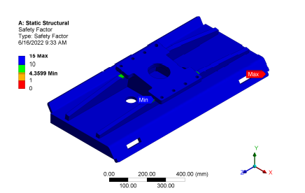 De forma similar, el factor de seguridad resultante del análisis de fatiga reportó un número mínimo de 4,3599 (Figura 14), es cual es mayor que 1; por tanto, este diseño puede considerarse confiable.