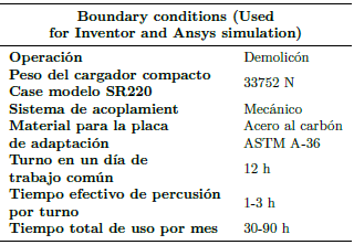 Se tomaron mediciones físicas del martillo hidráulico Atlas Copco SB202 y de la región superior de montaje del brazo, considerando las mediciones tridimensionales para conectar ambas máquinas, y posteriormente se hizo un dibujo tridimensional utilizando el software Inventor Professional and Ansys para analizar el comportamiento estructural estático y dinámico bajo una frecuencia de impacto máxima de 1800 golpes por minuto (BPM, Blows per Minute, por sus siglas en inglés). Para el análisis, la placa de adaptación se hizo independiente del sistema del brazo del cargador compacto y el martillo hidráulico. Se aplicaron condiciones de borde tales como la gravedad, el peso de 16 750 N aplicado a la placa de adaptación y la fuerza hidráulica en regiones de contacto con el martillo y cargador compacto.