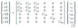 Además, en el análisis del material se toma como referencia la simetría ortótropa, y la ecuación constitutiva del material en la ecuación (1), para un sistema cartesiano en las tres direcciones perpendiculares entre sí, donde los esfuerzos (σ) son igual a la matriz de rigidez (C) por las deformaciones (ε) [19].
