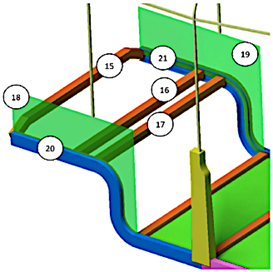En la Figura 9 se muestran las restricciones aplicadas (representados por estrellas identificadas con letra F), así como las cargas empleadas (vectores identificados con anotación B y C de dirección encerrados con círculos) para el análisis de la torsión en la estructura, donde se obtienen valores de deformación.