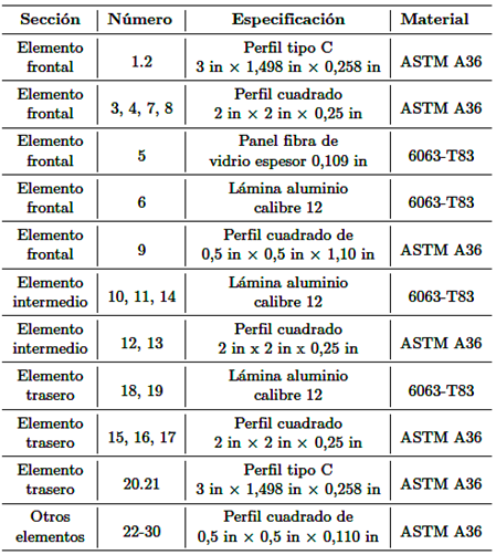 En la Tabla 4 se anotan los diferentes componentes empleados y su descripción respecto del tipo de perfil empleado para la evaluación estructural.