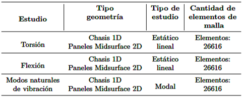 Una vez considerado esto, se propuso realizar tres estudios en el software ANSYS, con la finalidad de evaluar: rigidez torsional, rigidez por flexión y modos naturales de vibración.