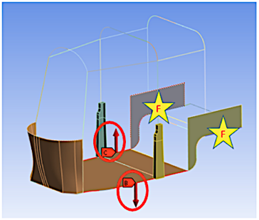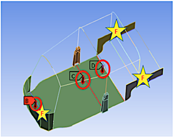 En la Figura 10 se observan las restricciones aplicadas (representados por estrellas identificadas con letra F), así como las cargas empleadas (vectores de dirección con anotación B, C y D encerrados con círculos) para el análisis de la flexión en la estructura, donde se obtienen valores de deformación.