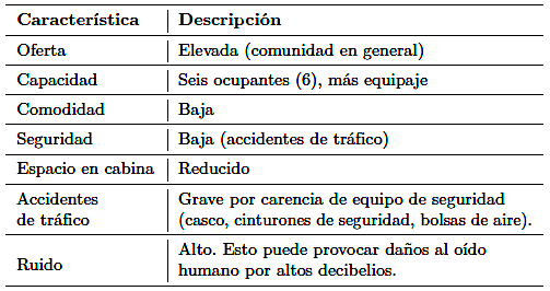 En el estudio del análisis del mototaxi que se llevó a cabo, se tomaron en cuenta principalmente las categorías denominadas como “auto mini”, “auto compacto” y “convertible”, para hacer una comparación similar, haciendo énfasis en este último por la configuración que presenta el mototaxi al ser un vehículo con un diseño estructural mayoritario en la parte inferior, asemejándose más a la categoría de “convertible”.