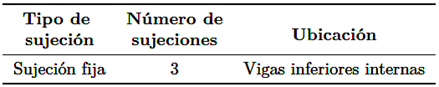 Para el estudio modal, se propuso analizar los seis modos naturales de vibración del modelo, y en la Figura 11 se ilustran las restricciones de posición empleadas en la estructura del vehículo, para efectuar dicho análisis. Por su parte, la Tabla 7 indica el tipo de sujeción empleado en el estudio.