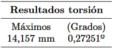 Como se observa en la Tabla 8 se obtuvo un valor de 27,35 KNm/º, esto basado en la carga torsional aplicada y un ángulo obtenido de torsión de la estructura de 0,27251°. Adicionalmente, la deformación máxima presentada es de 14,157 mm.