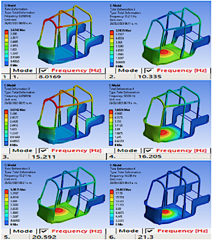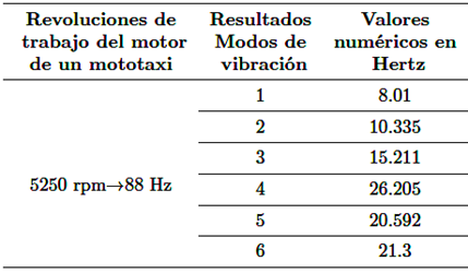 Para el análisis modal de la estructura del mototaxi, la Figura 14 presenta los diferentes modos de vibración de la estructura analizada. Como parte de dicha evaluación, se identificaron las revoluciones de operación típicas del motor del vehículo, para lo cual se encontró en 88 Hz la frecuencia de operación del mismo.