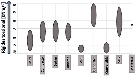 Con el objetivo de identificar si los valores obtenidos de torsión y flexión son adecuados para la estructura analizada, se tomó como referencia la comparación realizada por Hirz. Esta considera nueve categorías diferentes, en las que se reportan ciertos rangos de esfuerzos torsionales para cada categoría [13].